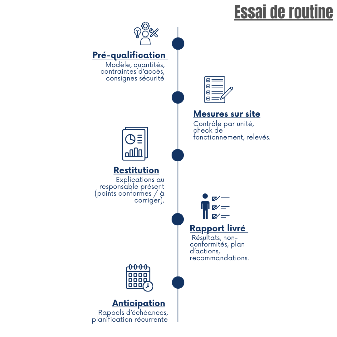 Nous assurons la pérennité et le maintien des performances de vos installations grâce aux ESSAIS DE ROUTINE.
